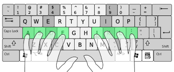 | Tangan Kiri Jari Kelingking : Baris Pertama = ‘ dan 1 Baris Kedua = Tab dan Q Baris Ketiga = Capslock dan A Baris Keempat = Shift kiri dan Z Baris Kelima = Ctrl dan Windows Jari Manis : Baris Pertama = 2 Baris Kedua = W Baris Ketiga = S Baris Keempat = X Jari Tengah : Baris Pertama = 3 Baris Kedua = E Baris Ketiga = D Baris Keempat = C Jari Telunjuk : Baris Pertama = 4 dan 5 Baris Kedua = R dan T Baris Ketiga = F dan G Baris Keempat = V dan B Ibu Jari : Baris Kelima = Alt kiri dan Spasi | Tangan kanan Ibu Jari : Baris Kelima = Alt kanan dan Spasi Jari Telunjuk : Baris Pertama = 6 dan 7 Baris Kedua = Y dan U Baris Ketiga = H dan J Baris Keempat = N dan M Jari Tengah : Baris Pertama = 8 Baris Kedua = I Baris Ketiga = K Baris Keempat = , Jari Manis : Baris Pertama = 9 Baris Kedua = O Baris Ketiga = L Baris Keempat = . Jari Kelingking : Baris Pertama = 0, -, = dan BackSpace Baris Kedua = P, [ dan ] Baris Ketiga = , ;, ‘ dan Enter Baris Keempat = / dan shift kanan. |